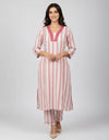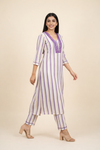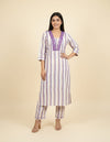 Upgrade your everyday ethnic wardrobe with this effortlessly stylish A-line kurta pant set, designed for comfort, versatility, and timeless appeal. Crafted in soft, breathable fabric, the kurta features elegant vertical stripes that create a flattering silhouette, paired with a beautifully detailed intricate lace neckline for a touch of sophistication.